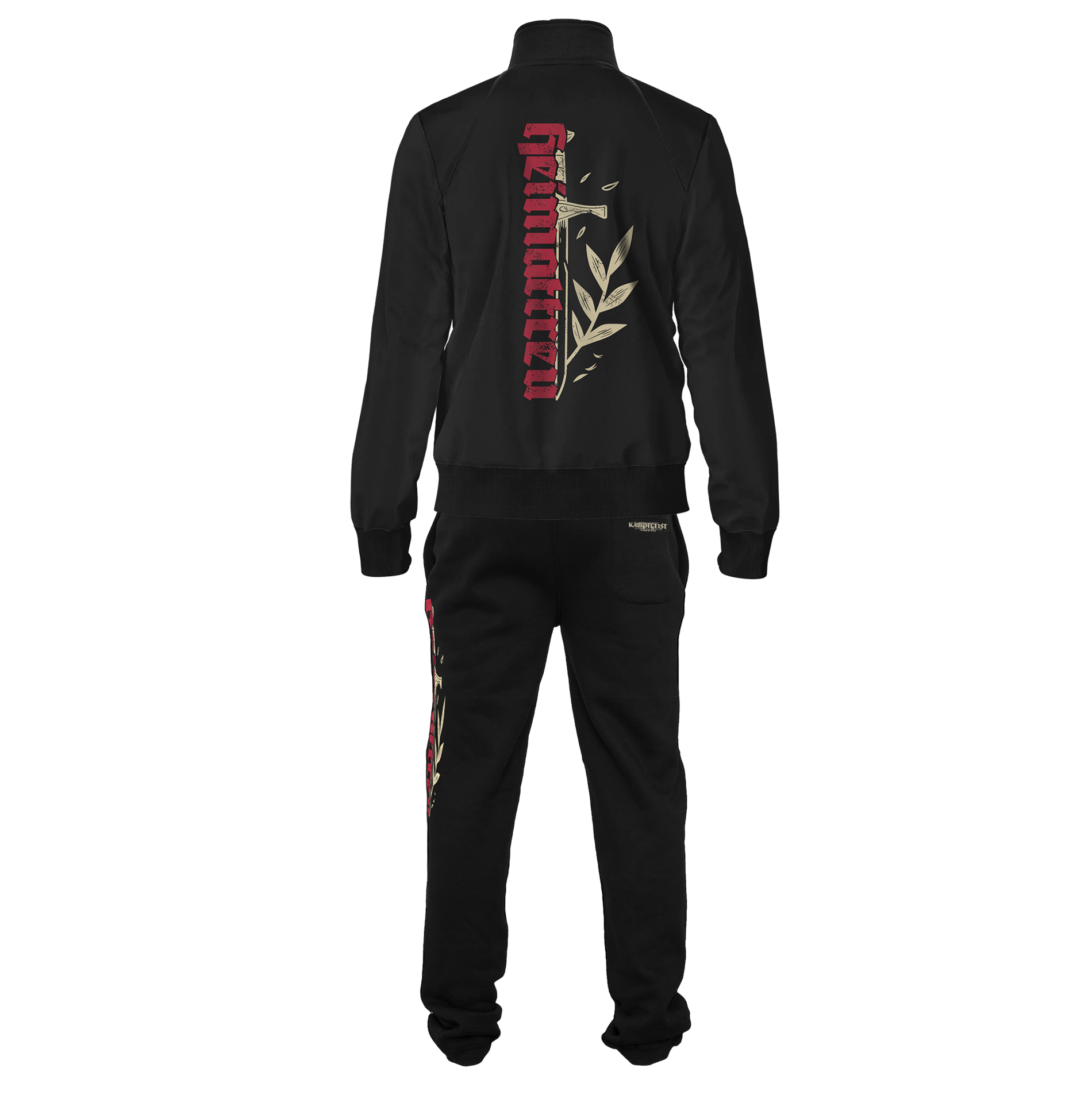 Die Trainingsjacke überzeugt mit dem dezenten GHTx25-Logo auf der Brust und dem großen HEIMATTREU-Schwert-Motiv auf dem Rücken – ein Symbol für Treue und Standhaftigkeit. Die Jogginghose greift dieses Motiv mit dem großflächigen Schwert-Print am Bein auf. Zusammen ergeben sie einen sportlich-markanten Look, der klar Position bezieht.